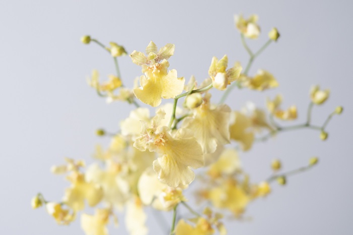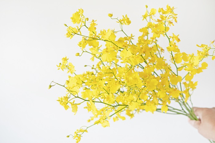 文心蘭的花不大,但單枝花朵數量多,延著花梗呈放射狀分布,因此只要取幾枝文心蘭瓶插,調整好花梗延伸的方向,便能創造很明亮飽滿的視覺效果。 不過有時候為了作品畫面乾淨,須將下方的側枝挑起來,這時如果能將這些側枝整理起來,搭配上簡單的葉材,還能多綁幾把小花束哦~ 簡單將之投入小玻璃瓶當中, 就能為夏日餐桌上增添清新的黃綠色小品。